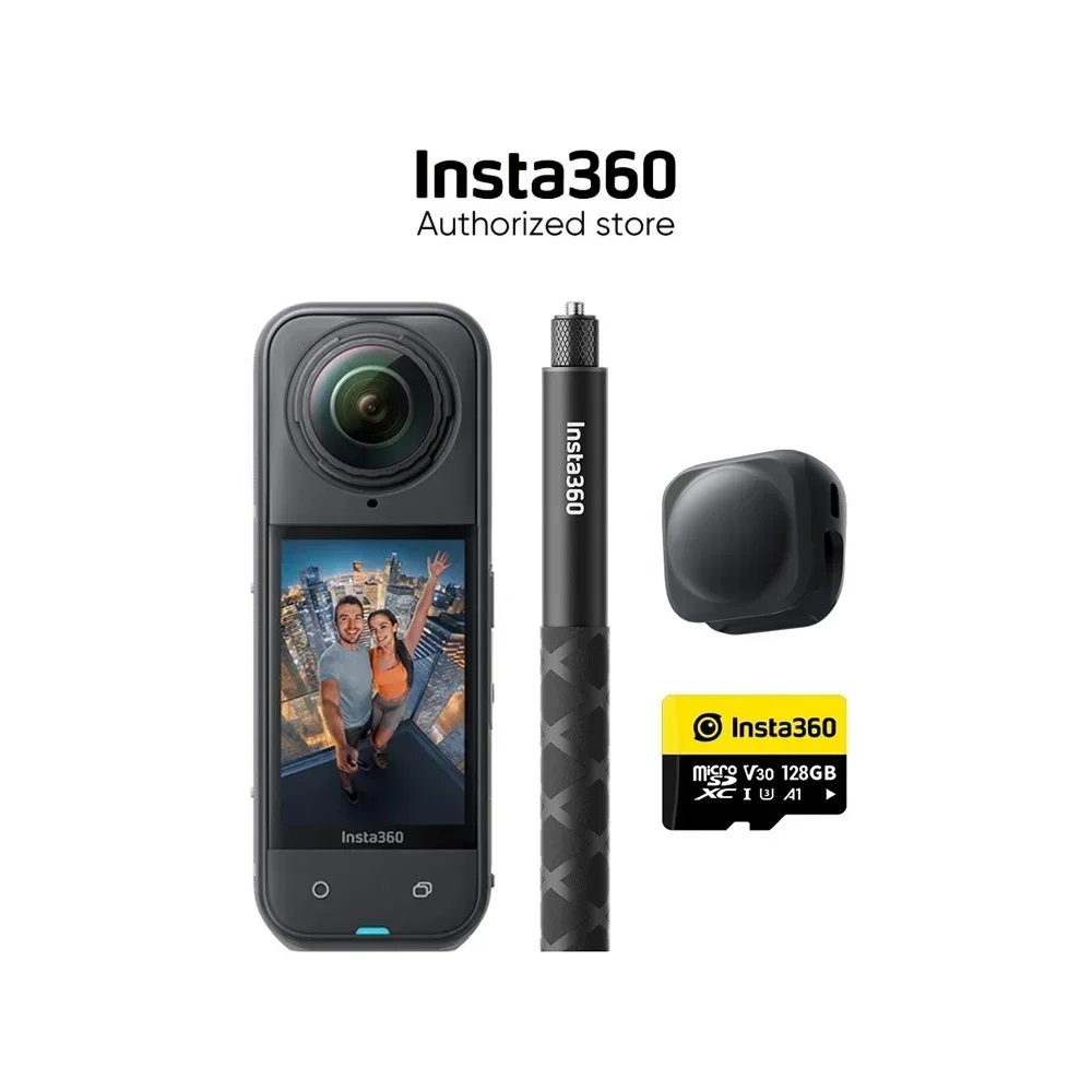 Get-Set Bundle includes 1x Insta360 X5, 1x Lens Cap and 1x 114cm Invisible Selfie Stick.1x Insta360 128GB microSD card.