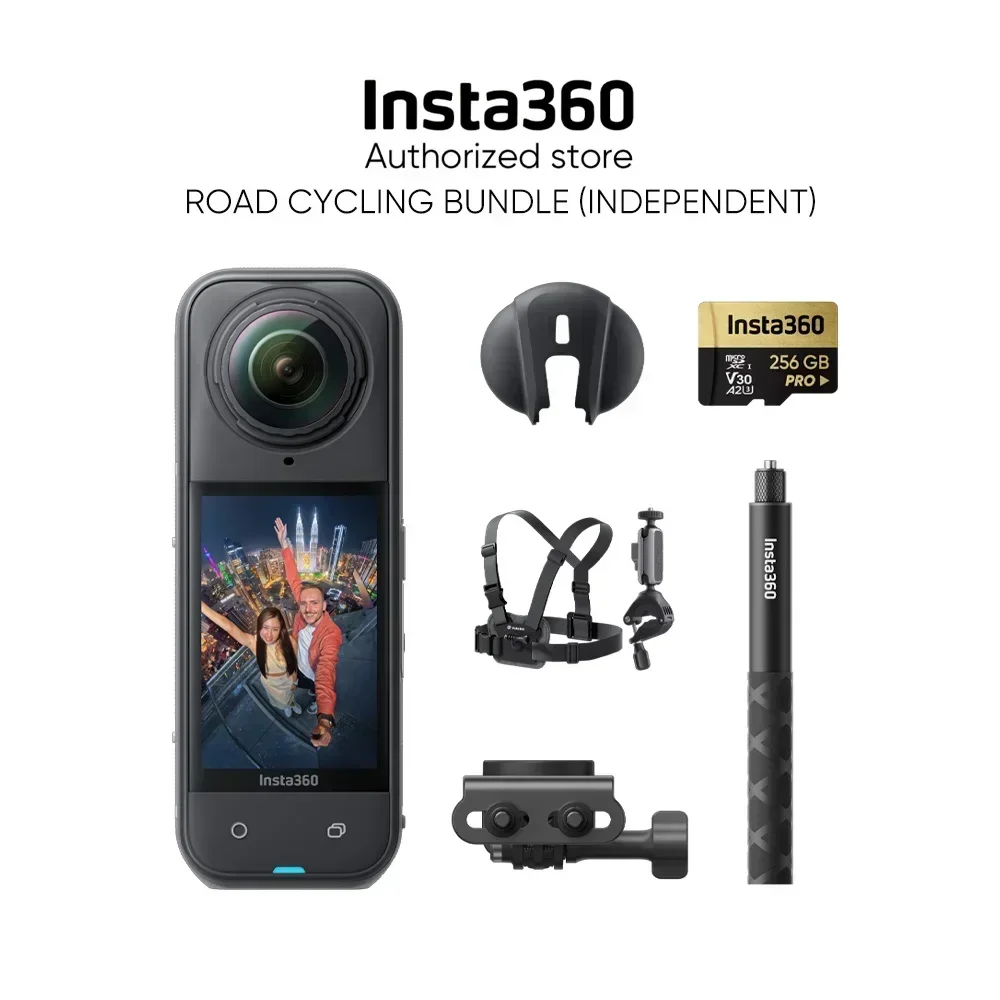 Bicycle Bundle (Independent) includes 1x Insta360 X5, 1x Lens Cap, 1x 114cm Invisible Selfie Stick, 1x Bike Computer Mount (Independent Handlebars) and 1x Bike Kit.1x Insta360 256GB microSD card.